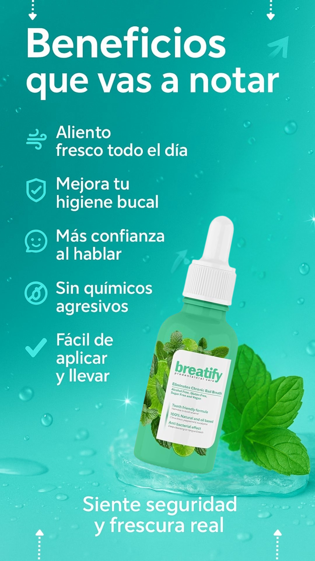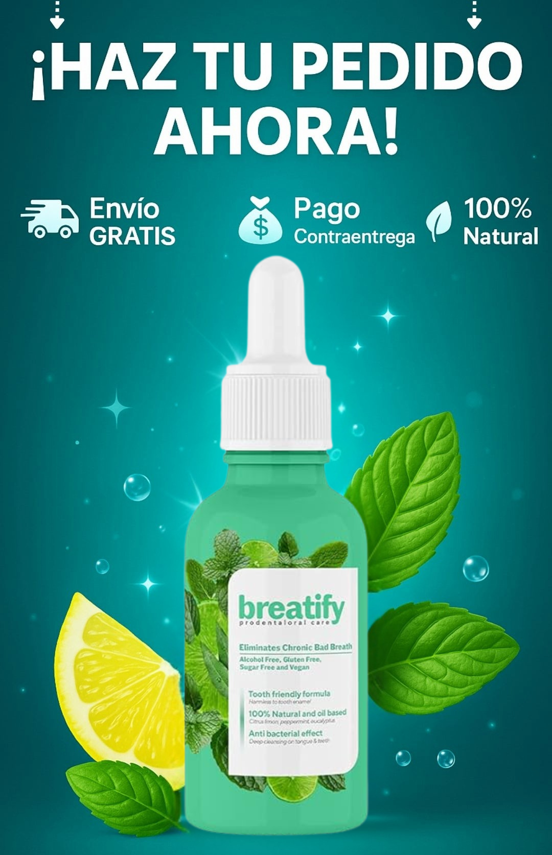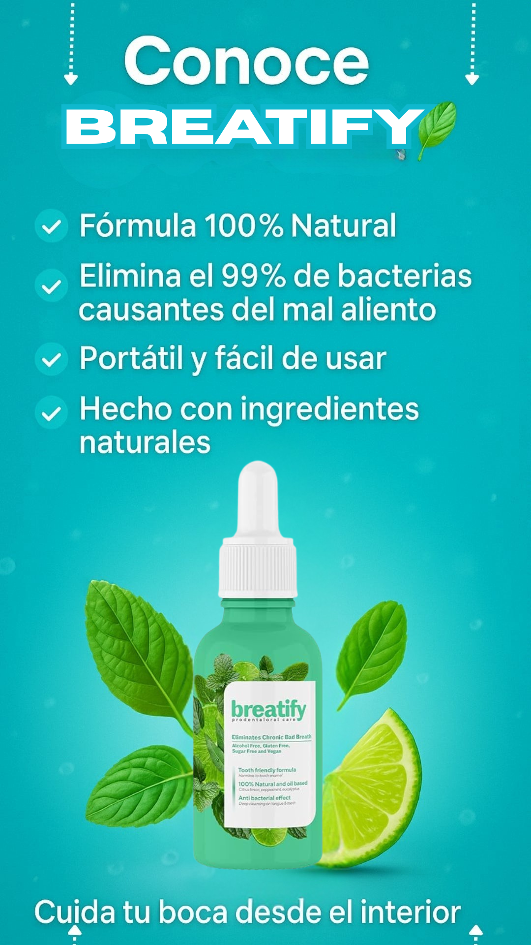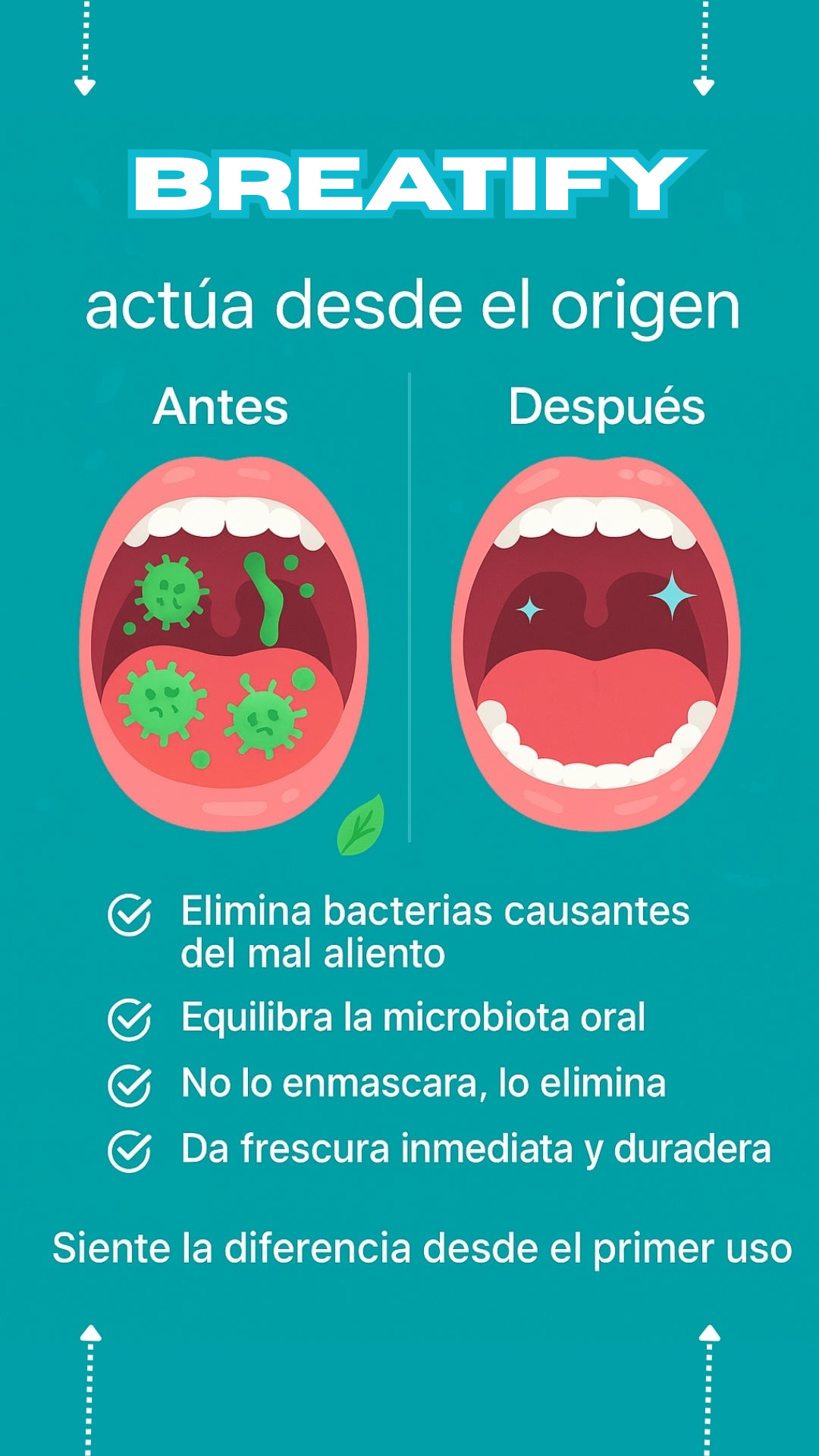 Breatify elimina bacterias que causan el mal aliento desde el interior, actuando con clorofila y extractos naturales.